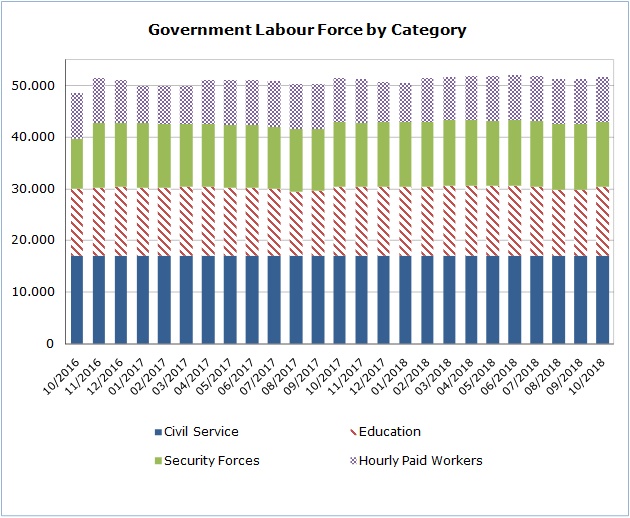 In October 2018 the Government labour force increased by 56 persons (0,1%) in comparison to the corresponding month of 2017 and reached 51.670 persons. Permanent staff decreased by 710 persons (-2,0%). The casual staff increased by 4,8% and reached 16.579 persons compared to 15.813 persons in October 2017.